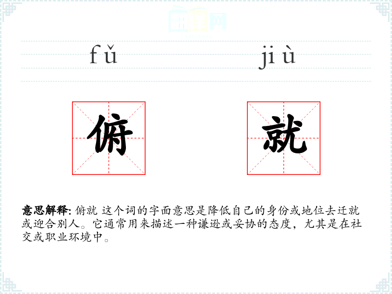 俯就 这个词的字面意思是降低自己的身份或地位去迁就或迎合别人。它通常用来描述一种谦逊或妥协的态度,尤其是在社交或职业环境中。