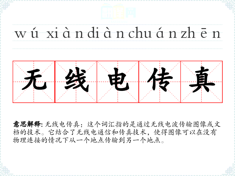 无线电传真:这个词汇指的是通过无线电波传输图像或文档的技术。它结合了无线电通信和传真技术,使得图像可以在没有物理连接的情况下从一个地点传输到另一个地点。