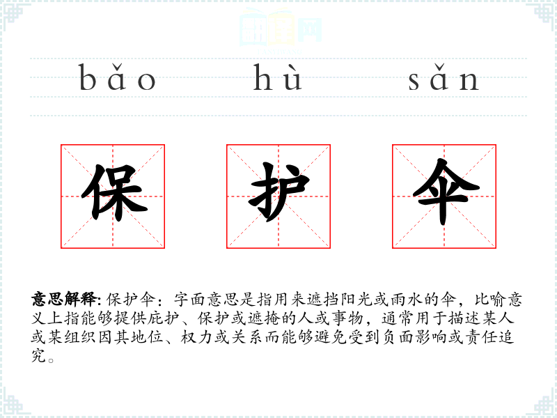 保护伞:字面意思是指用来遮挡阳光或雨水的伞,比喻意义上指能够提供庇护、保护或遮掩的人或事物,通常用于描述某人或某组织因其地位、权力或关系而能够避免受到负面影响或责任追究。
