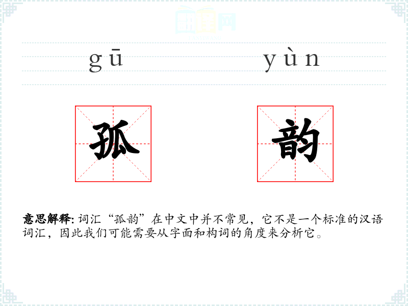 词汇“孤韵”在中文中并不常见,它不是一个标准的汉语词汇,因此我们可能需要从字面和构词的角度来分析它。