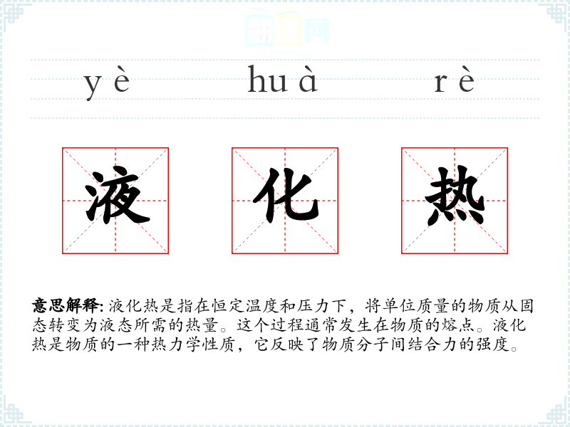 - 反义词:汽化热(vaporization heat),指的是物质从液态转变为气态所需的热量。