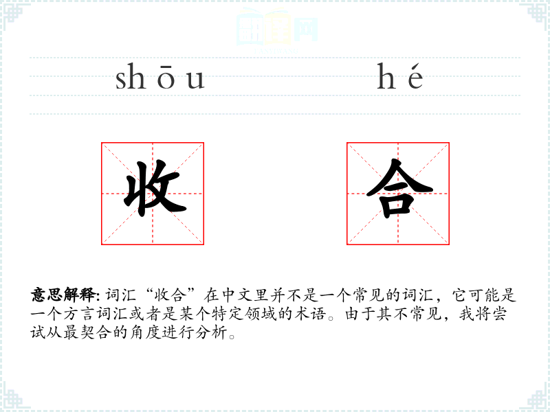 由于“收合”不是一个标准词汇,其词源和演变可能无法追溯。如果它是一个方言词汇,那么它的词源可能与该方言的历史和文化背景有关。