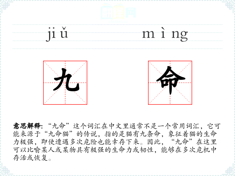 “九命”这个词源于民间对猫的传说,认为猫有九条命。这种说法可能起源于古代人们对猫神秘和灵活特性的观察,以及它们在危险情况下的生存能力。随着时间的推移,这个词汇被用来比喻人的生存能力和韧性。