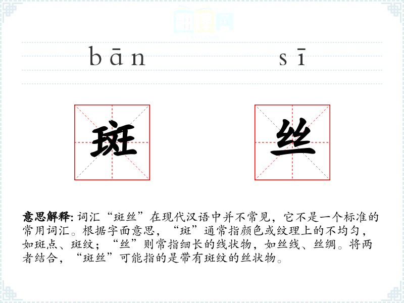 由于“斑丝”不是一个常用词汇,其词源和历史演变难以考证。它可能是由“斑”和“丝”两个常用词汇组合而成的新词。