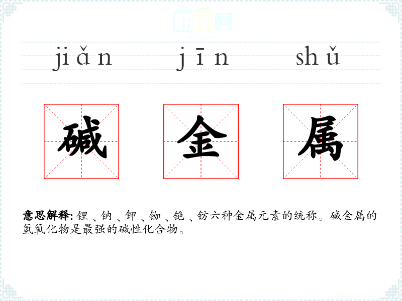 锂﹑钠﹑钾﹑铷﹑铯﹑钫六种金属元素的统称。碱金属的氢氧化物是最强的碱性化合物。