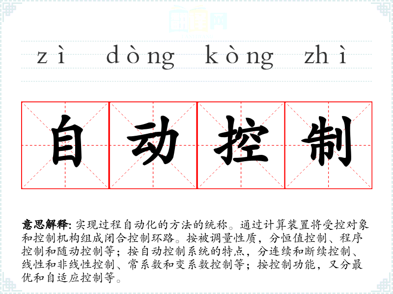 1.实现过程自动化的方法的统称。通过计算装置将受控对象和控制机构组成闭合控制环路。按被调量性质,分恒值控制、程序控制和随动控制等;按自动控制系统的特点,分连续和断续控制、线性和非线性控制、常系数和变系数控制等;按控制功能,又分最优和自适应控制等。