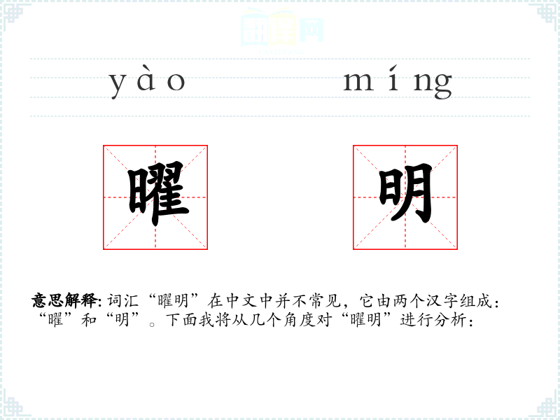 词汇“曜明”在中文中并不常见,它由两个汉字组成:“曜”和“明”。下面我将从几个角度对“曜明”进行分析: