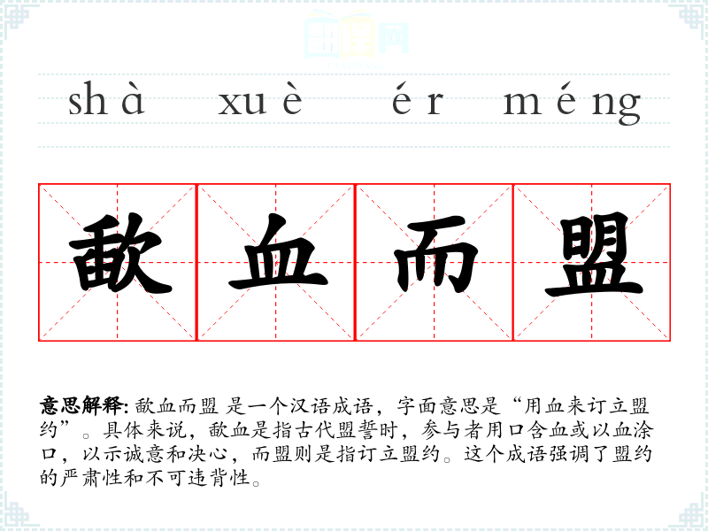 歃血而盟 是一个汉语成语,字面意思是“用血来订立盟约”。具体来说,歃血是指古代盟誓时,参与者用口含血或以血涂口,以示诚意和决心,而盟则是指订立盟约。这个成语强调了盟约的严肃性和不可违背性。