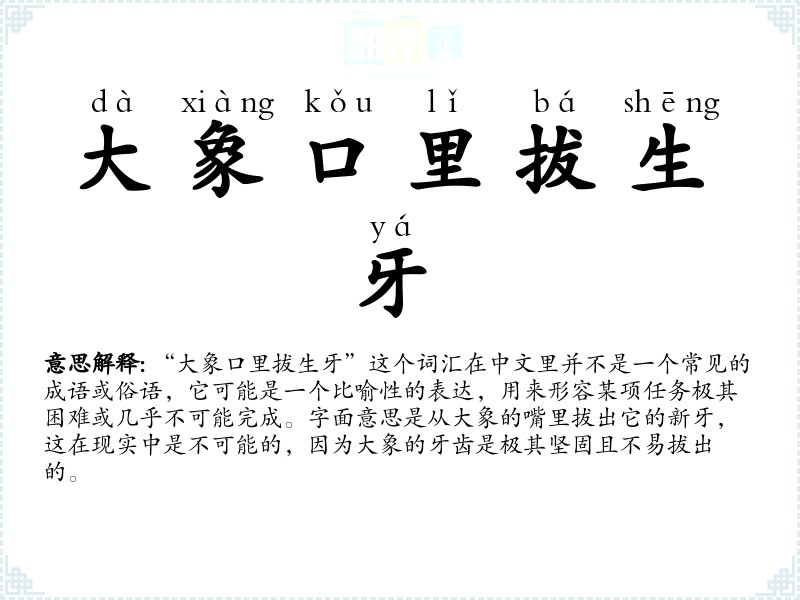 在**文化中,大象通常象征着力量和智慧。因此,从大象口里拔生牙这个比喻可能强调了任务的艰巨性和对智慧的挑战。