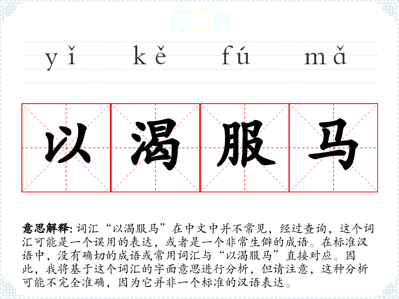 词汇“以渴服马”在中文中并不常见,经过查询,这个词汇可能是一个误用的表达,或者是一个非常生僻的成语。在标准汉语中,没有确切的成语或常用词汇与“以渴服马”直接对应。因此,我将基于这个词汇的字面意思进行分析,但请注意,这种分析可能不完全准确,因为它并非一个标准的汉语表达。