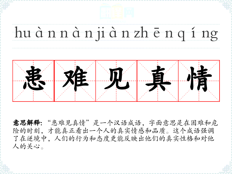 “患难见真情”是一个汉语成语,字面意思是在困难和危险的时刻,才能真正看出一个人的真实情感和品质。这个成语强调了在逆境中,人们的行为和态度更能反映出他们的真实性格和对他人的关心。