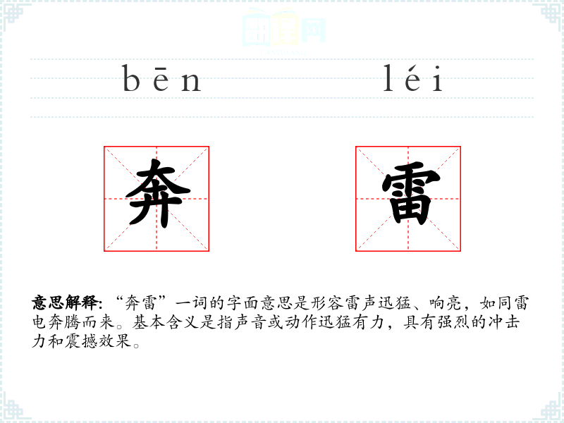 “奔雷”一词源于古代汉语,其中“奔”字意为奔跑、快速移动,“雷”字意为雷电。在古代文学中,常用来形容雷声的迅猛和响亮。随着时间的推移,其用法逐渐扩展到形容各种具有强烈冲击力和震撼效果的事物。
