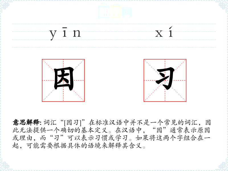 词汇“[因习]”在标准汉语中并不是一个常见的词汇,因此无法提供一个确切的基本定义。在汉语中,“因”通常表示原因或理由,而“习”可以表示习惯或学习。如果将这两个字组合在一起,可能需要根据具体的语境来解释其含义。