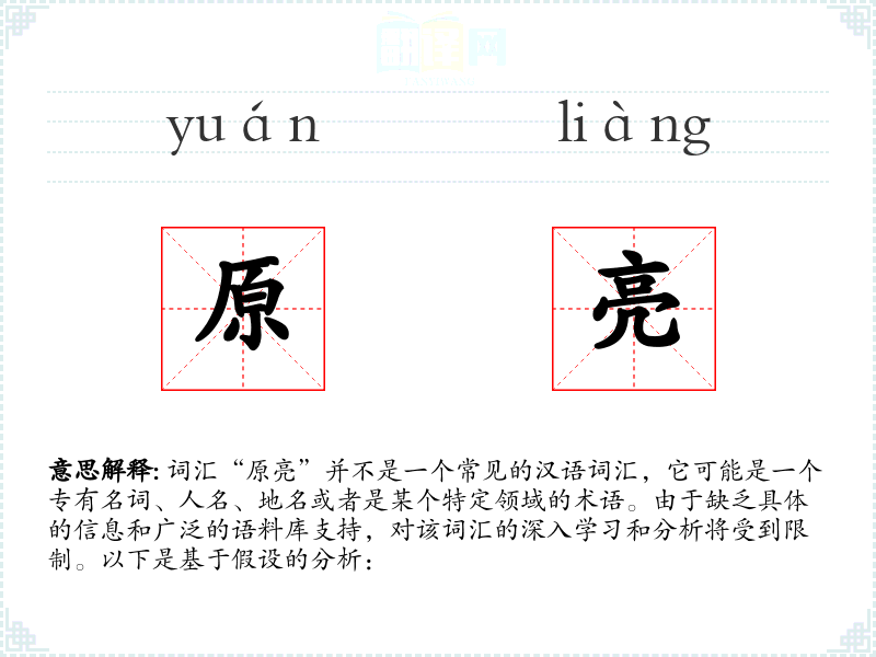 - 字面意思:如果“原亮”是一个合成词,那么“原”可能指的是原始、原本、原野等含义,“亮”则通常表示明亮、清晰、显露等含义。