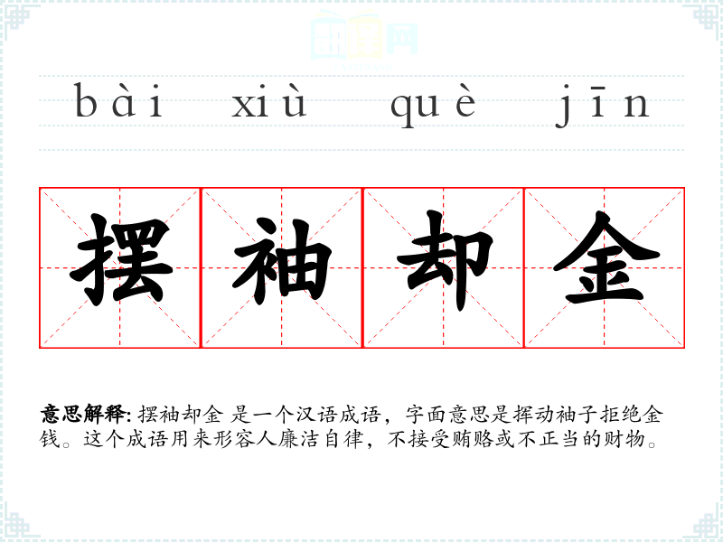 摆袖却金 是一个汉语成语,字面意思是挥动袖子拒绝金钱。这个成语用来形容人廉洁自律,不接受贿赂或不正当的财物。