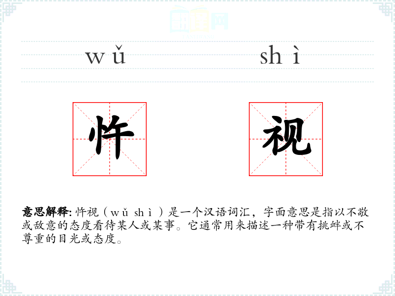 “忤视”这个词在描述人际关系中的不友好态度时非常有用。它不仅传达了视觉上的不尊重,也反映了更深层次的情感和态度。在我的语言学*和表达中,理解并正确使用这样的词汇,有助于更准确地传达复杂的情感和态度。
