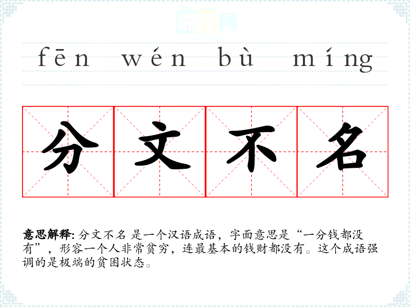 分文不名 是一个汉语成语,字面意思是“一分钱都没有”,形容一个人非常贫穷,连最基本的钱财都没有。这个成语强调的是极端的贫困状态。