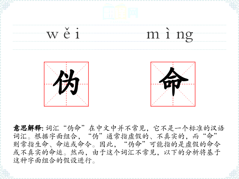 词汇“伪命”在中文中并不常见,它不是一个标准的汉语词汇。根据字面组合,“伪”通常指虚假的、不真实的,而“命”则常指生命、命运或命令。因此,“伪命”可能指的是虚假的命令或不真实的命运。然而,由于这个词汇不常见,以下的分析将基于这种字面组合的假设进行。