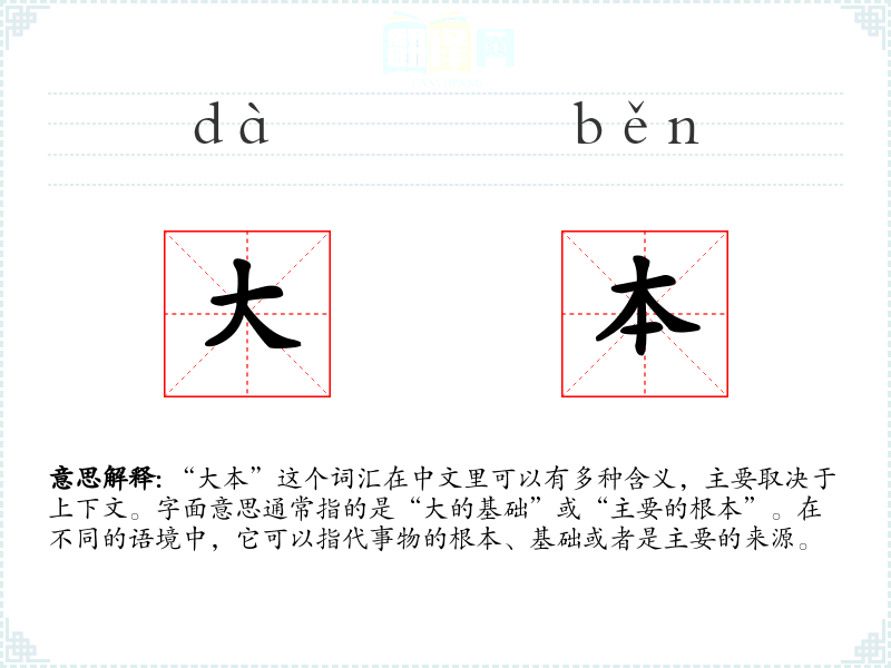 “大本”这个词汇在中文里可以有多种含义,主要取决于上下文。字面意思通常指的是“大的基础”或“主要的根本”。在不同的语境中,它可以指代事物的根本、基础或者是主要的来源。