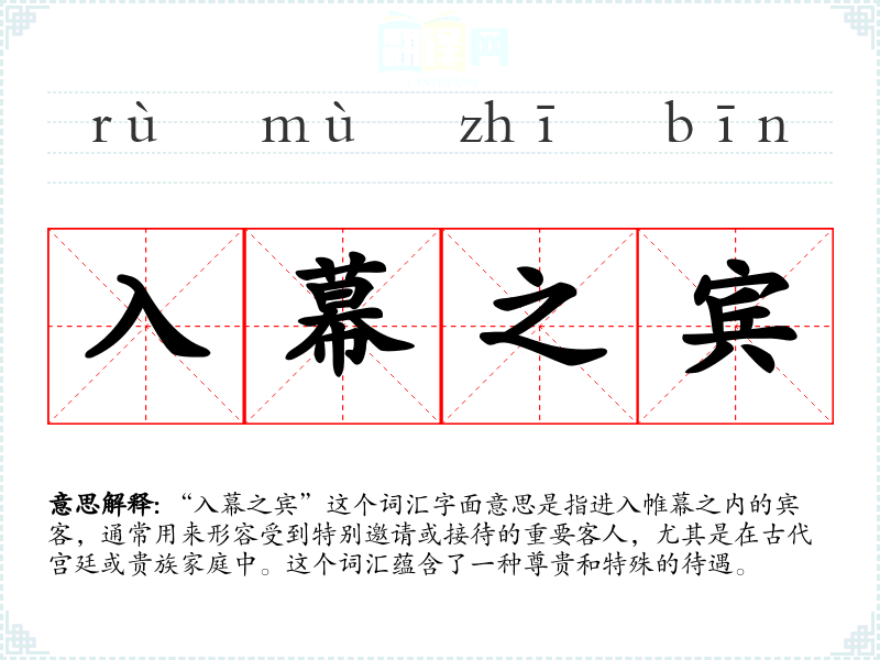 “入幕之宾”这个词汇字面意思是指进入帷幕之内的宾客,通常用来形容受到特别邀请或接待的重要客人,尤其是在古代宫廷或贵族家庭中。这个词汇蕴含了一种尊贵和特殊的待遇。