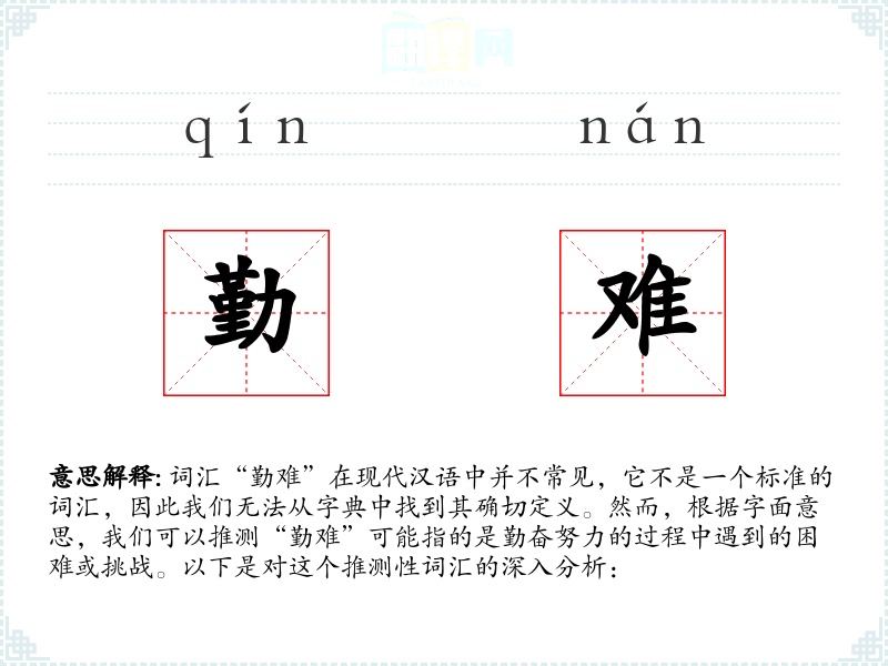 词汇“勤难”在现代汉语中并不常见,它不是一个标准的词汇,因此我们无法从字典中找到其确切定义。然而,根据字面意思,我们可以推测“勤难”可能指的是勤奋努力的过程中遇到的困难或挑战。以下是对这个推测性词汇的深入分析: