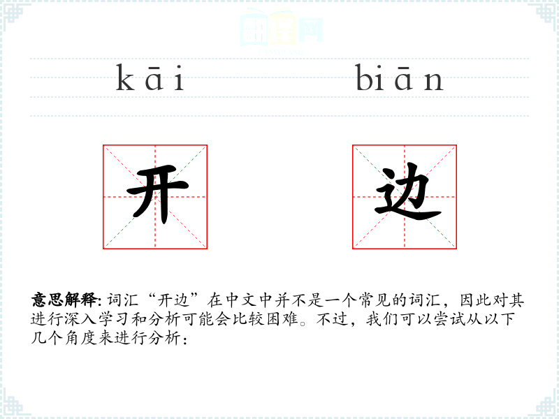“开边”这个词汇在中文中并不常见,其使用和理解可能需要特定的语境和背景知识。在语言学*和表达中,了解这样的词汇可以帮助我们更深入地理解特定领域的专业术语和历史背景。