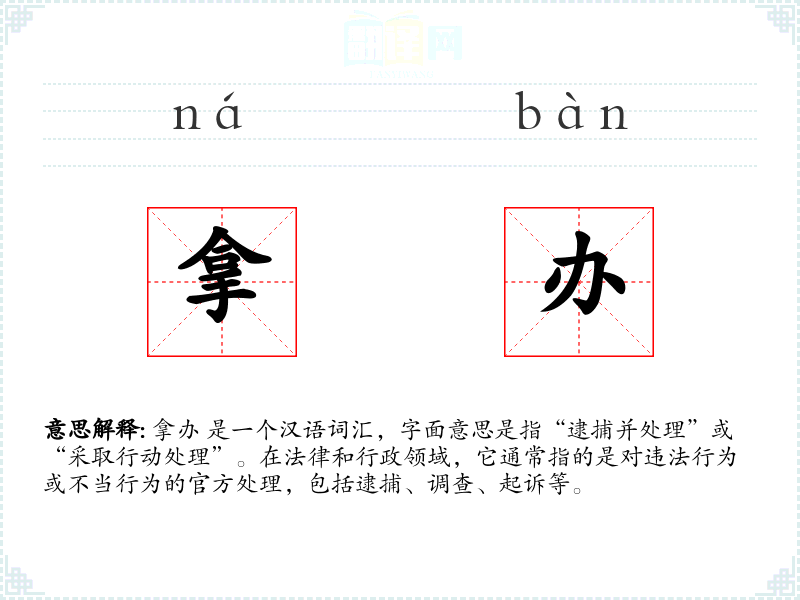 “拿办”一词源于汉语,其中“拿”指的是逮捕或抓住,“办”指的是处理或办理。在古代汉语中,“拿办”可能更多指的是逮捕和审讯,而在现代汉语中,它更多指的是官方的正式处理。