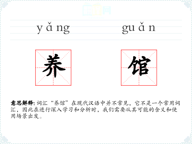 - 反义词:无(由于“养馆”不是一个常用词汇,反义词不适用)