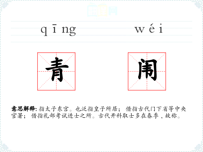 指太子东宫。也泛指皇子所居; 借指古代门下省等中央官署; 借指礼部考试进士之所。古代