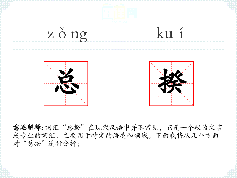 词汇“总揆”在现代汉语中并不常见,它是一个较为文言或专业的词汇,主要用于特定的语境和领域。下面我将从几个方面对“总揆”进行分析: