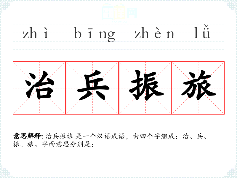 治兵振旅 是一个汉语成语,由四个字组成:治、兵、振、旅。字面意思分别是: