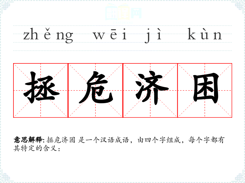 拯危济困 是一个汉语成语,由四个字组成,每个字都有其特定的含义: