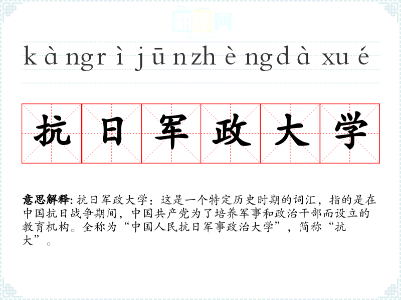 抗日军政大学:这是一个特定历史时期的词汇,指的是在抗日战争期间,共产党为了培养军事和政治干部而设立的教育机构。全称为“**人民抗日军事政治大学”,简称“抗大”。