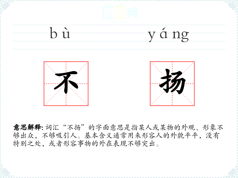 词汇“不扬”的字面意思是指某人或某物的外观、形象不够出众,不够吸引人。基本含义通常用来形容人的外貌平平,没有特别之处,或者形容事物的外在表现不够突出。