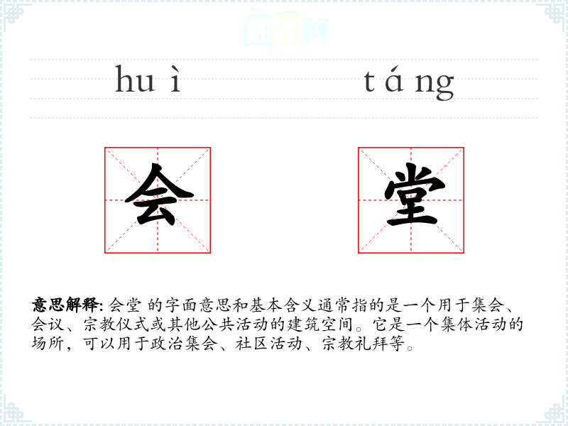 会堂 的字面意思和基本含义通常指的是一个用于、会议、仪式或其他公共活动的建筑空间。它是一个集体活动的场所,可以用于政治、社区活动、礼拜等。