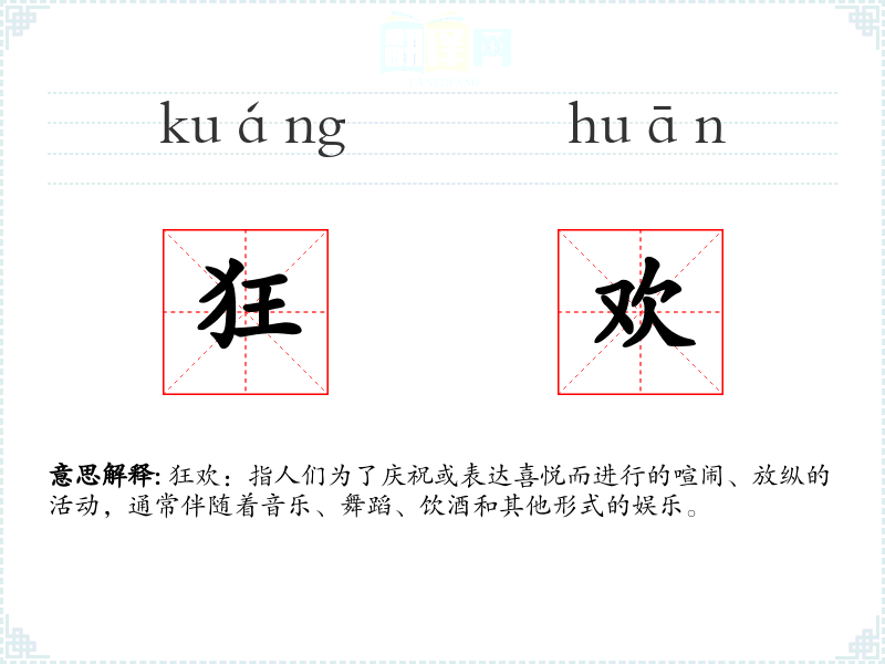 狂欢:指人们为了庆祝或表达喜悦而进行的喧闹、放纵的活动,通常伴随着音乐、舞蹈、饮酒和其他形式的娱乐。