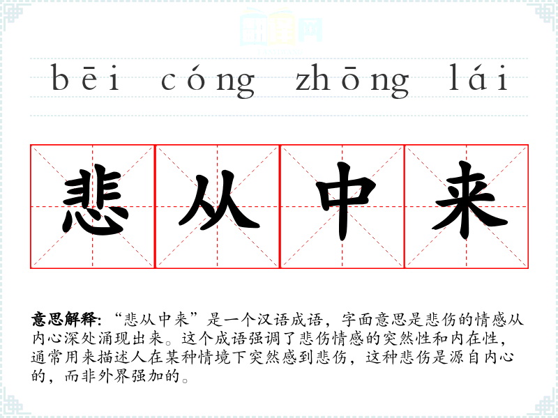 “悲从中来”是一个汉语成语,字面意思是悲伤的情感从内心深处涌现出来。这个成语强调了悲伤情感的突然性和内在性,通常用来描述人在某种情境下突然感到悲伤,这种悲伤是源自内心的,而非外界强加的。