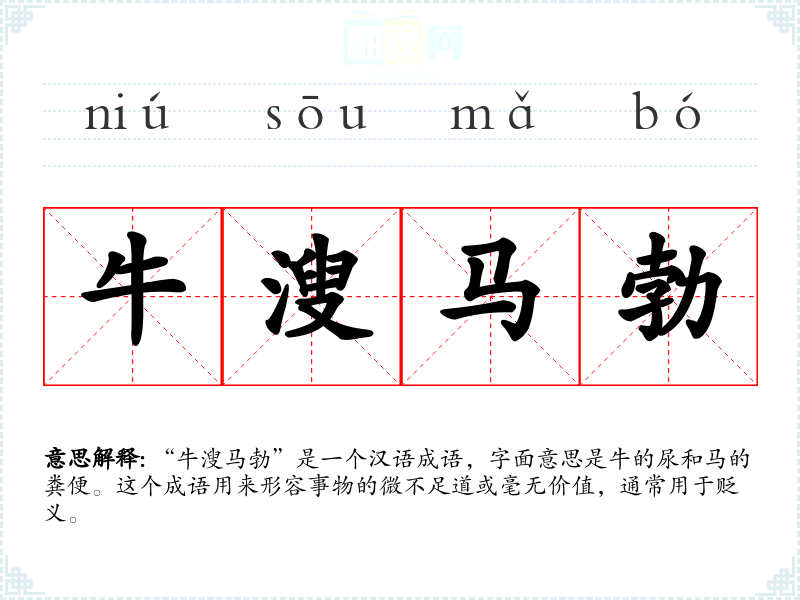“牛溲马勃”是一个汉语成语,字面意思是牛的尿和马的粪便。这个成语用来形容事物的微不足道或毫无价值,通常用于贬义。
