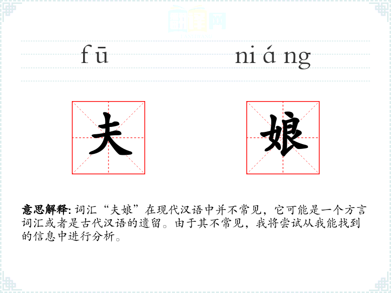 词汇“夫娘”在现代汉语中并不常见,它可能是一个方言词汇或者是古代汉语的遗留。由于其不常见,我将尝试从我能找到的信息中进行分析。