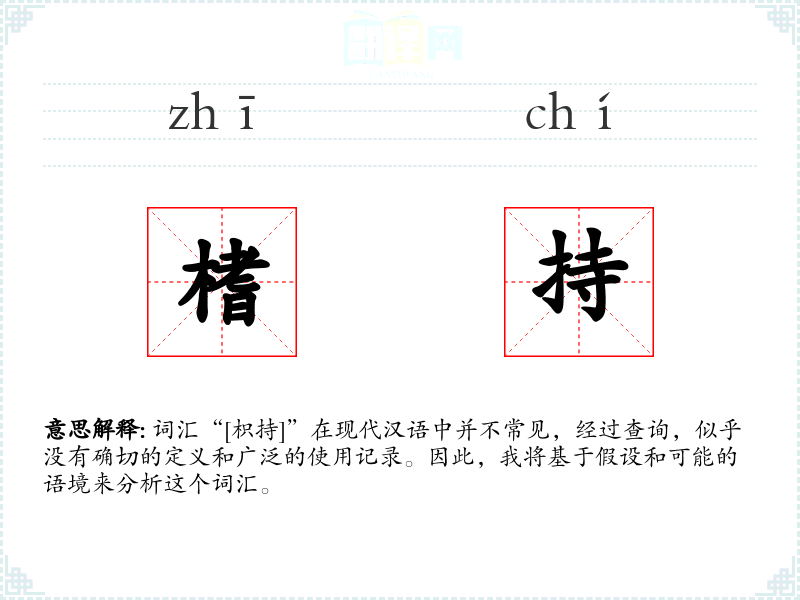 词汇“[枳持]”在现代汉语中并不常见,经过查询,似乎没有确切的定义和广泛的使用记录。因此,我将基于假设和可能的语境来分析这个词汇。
