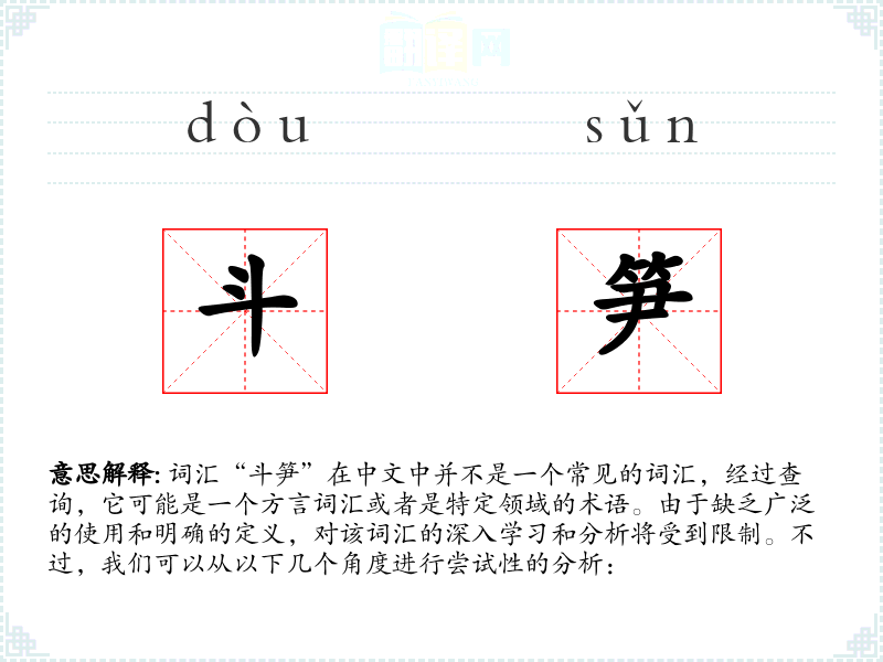 词汇“斗笋”在中文中并不是一个常见的词汇,经过查询,它可能是一个方言词汇或者是特定领域的术语。由于缺乏广泛的使用和明确的定义,对该词汇的深入学习和分析将受到限制。不过,我们可以从以下几个角度进行尝试性的分析: