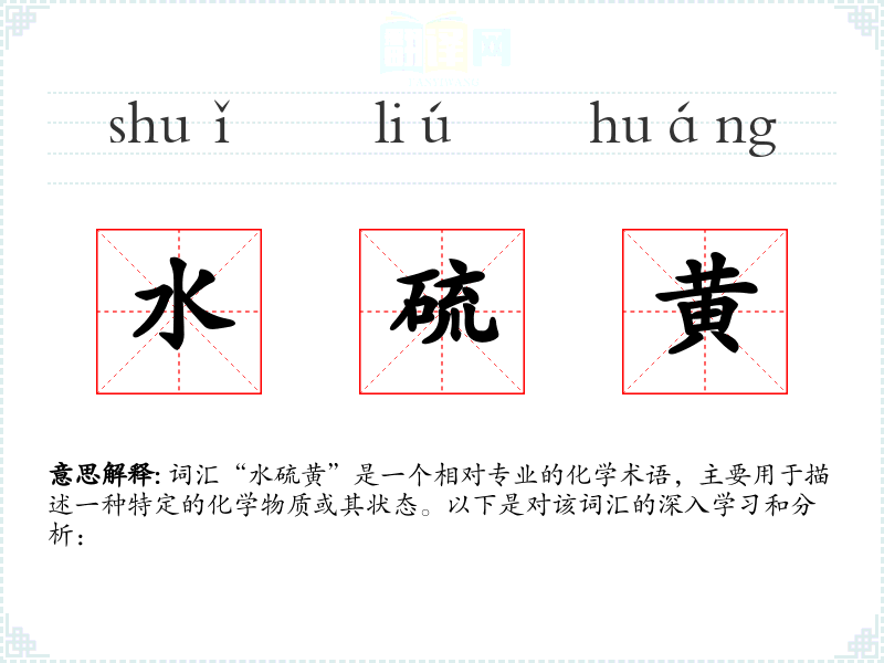 词汇“水硫黄”是一个相对专业的化学术语,主要用于描述一种特定的化学物质或其状态。以下是对该词汇的深入学习和分析: