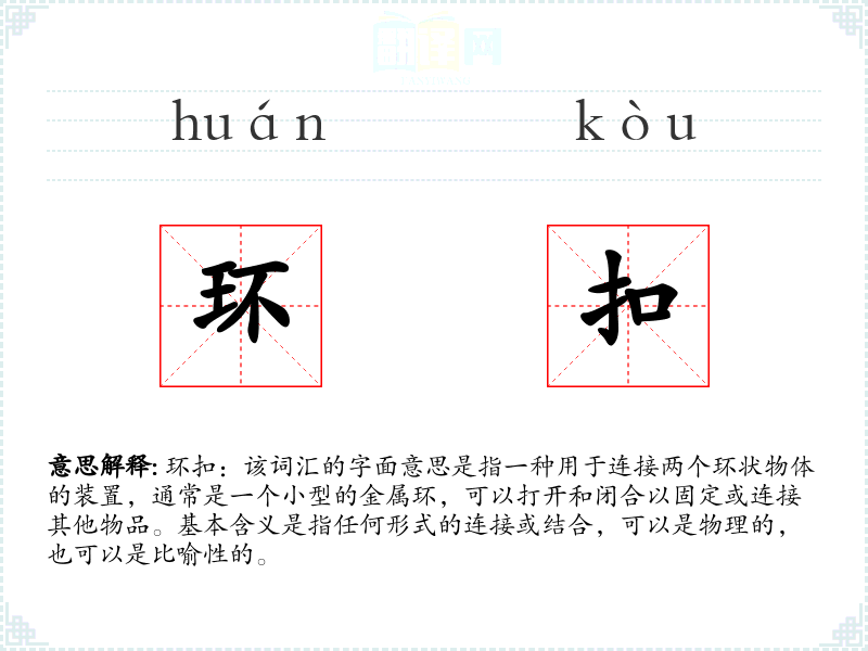 环扣:该词汇的字面意思是指一种用于连接两个环状物体的装置,通常是一个小型的金属环,可以打开和闭合以固定或连接其他物品。基本含义是指任何形式的连接或结合,可以是物理的,也可以是比喻性的。