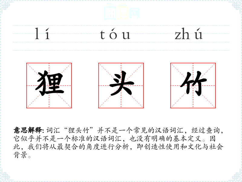词汇“狸头竹”并不是一个常见的汉语词汇,经过查询,它似乎并不是一个标准的汉语词汇,也没有明确的基本定义。因此,我们将从最契合的角度进行分析,即创造性使用和文化与社会背景。