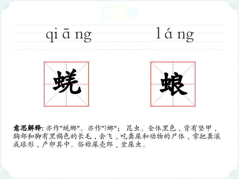亦作"蜣螂"。亦作"?螂"; 昆虫。全体黑色﹐背有坚甲﹐胸部和脚有黑褐色的长毛﹐会飞﹐吃粪屎和动物的尸体﹐常把粪滚成球形﹐产卵其中。俗称屎壳郎﹑坌屎虫。
