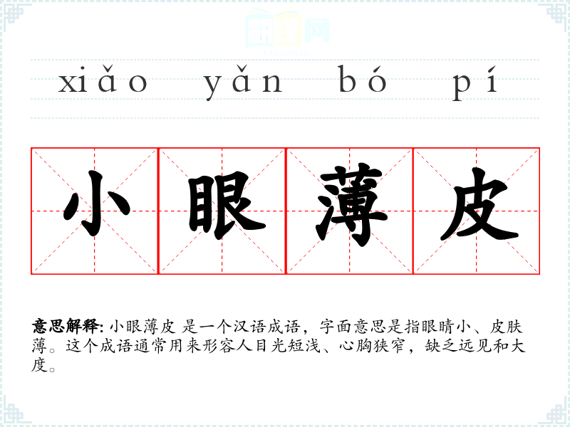 *小眼皮* 是一个汉语成语,字面意思是指眼睛小、皮肤。这个成语通常用来形容人目光短浅、心胸狭窄,缺乏远见和大度。