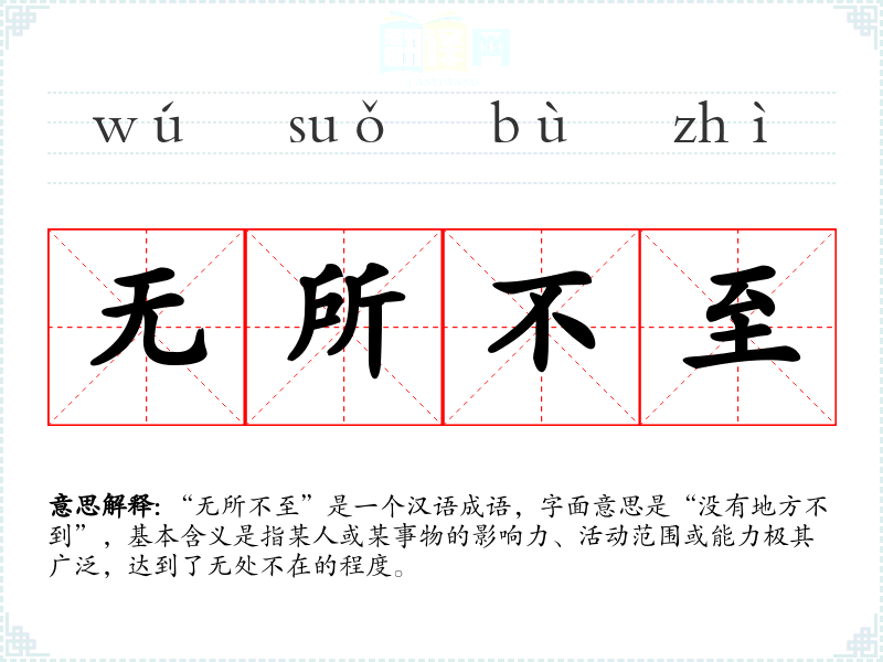 “无所不至”是一个汉语成语,字面意思是“没有地方不到”,基本含义是指某人或某事物的影响力、活动范围或能力极其广泛,达到了无处不在的程度。