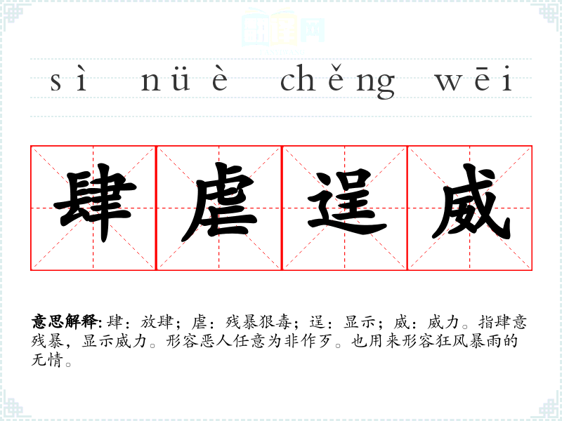 肆:放肆;虐:残暴狠毒;逞:显示;威:威力。指肆意残暴,显示威力。形容恶人任意