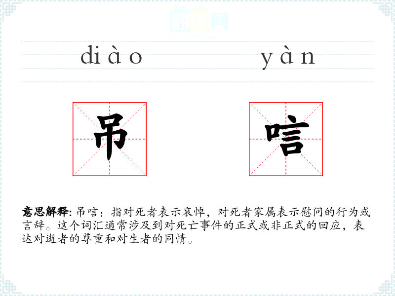 吊唁:指对死者表示哀悼,对死者家属表示慰问的行为或言辞。这个词汇通常涉及到对死亡**的正式或非正式的回应,表达对逝者的尊重和对生者的同情。