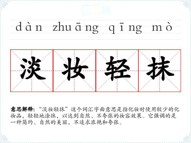 “淡妆轻抹”这个词汇字面意思是指化妆时使用较少的化妆品,轻轻地涂抹,以达到自然、不夸张的妆容效果。它强调的是一种简约、自然的美丽,不追求浓艳和夸张。